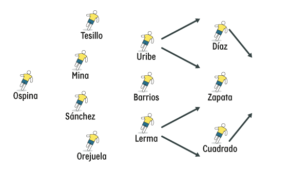 Los dos volantes que parten de la primera línea se proyectan por las bandas, los dos extremos van al centro para dar volúmen de ataque y los laterales también colaboran proyectándose.