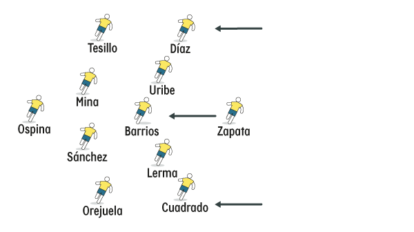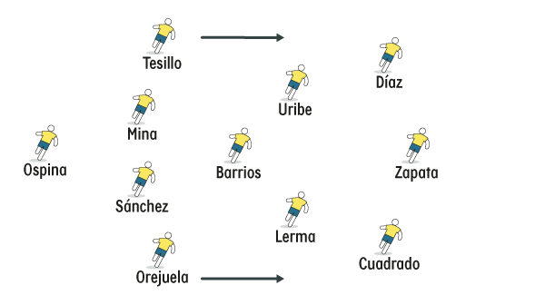 Queiroz dejó en claro que no va a jugar con línea de 3. Arma una defensa de 4, un volante central, dos mediocampistas de ida y vuelta a lado y lado de ese eje, dos extremos con llegada al área y un hombre en punta.